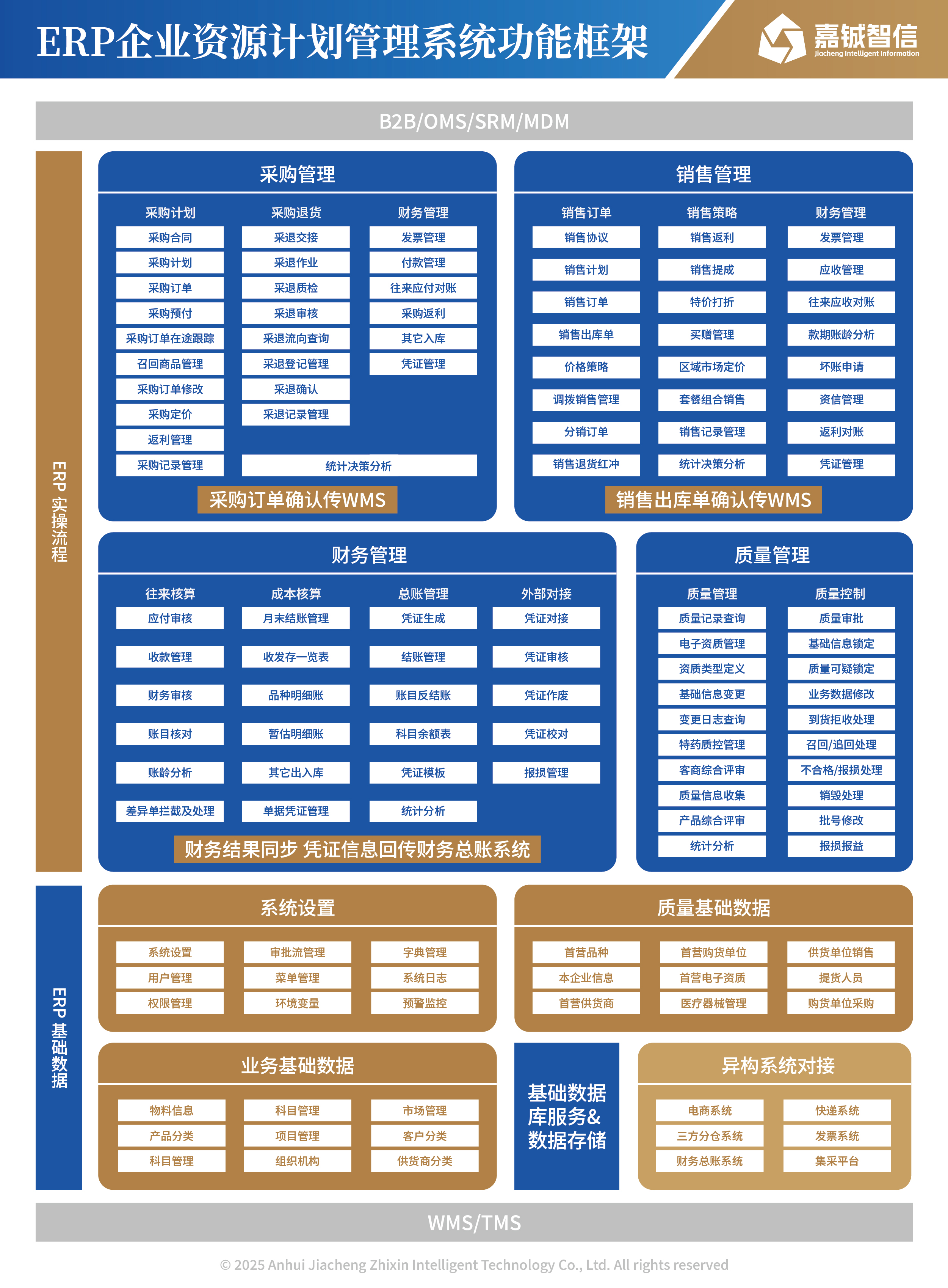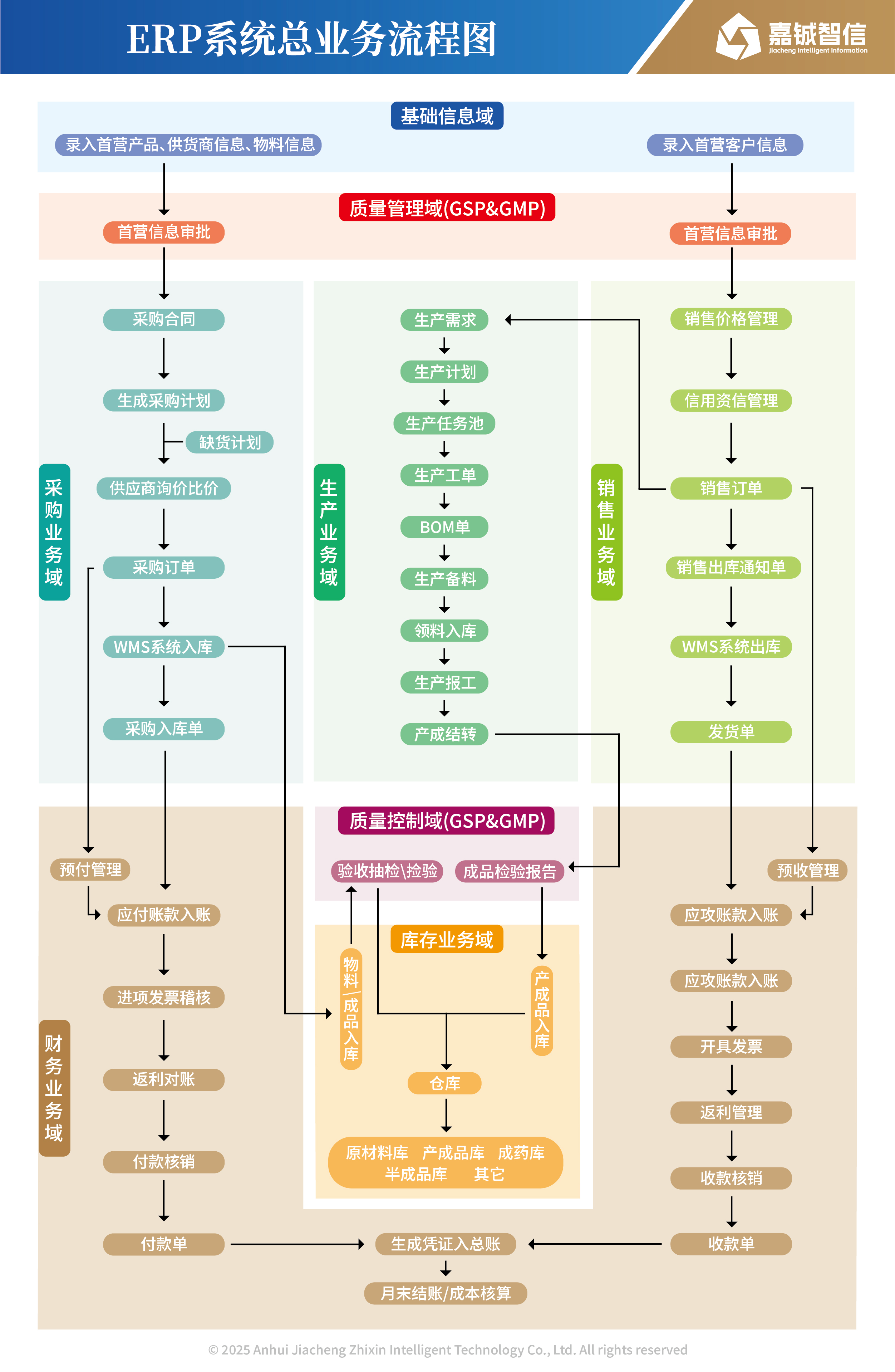 嘉铖企业资源计划管理系统医药批发版(ERP),产品深度集成医药行业质量管理特性,实现对普通药品、中药饮片、医疗器械、中药材商业流通业务全过程的管理。实现从集团化管理到独立业务单元运营,覆盖业务流程、质量控制、内部风控、上下游供应链服务、采购管理、销售管理、财务核算、物流管理的全面支撑。基于对进销存业务所引发的资金运转、往来账目、存货核算、票据传递的信息处理实现业财一体化管理,并对各岗位人员的绩效管理提供全面和实时数据支持,为企业领导提供基于企业全方位经营数据提供多元化、前瞻式得决策分析支持。适用于医药商业流通企业的各种细分业务形态,适配包括:商业调拨、快批、分销、控销、基药配送、医院纯销、B2B电子商务等多种业务模式。