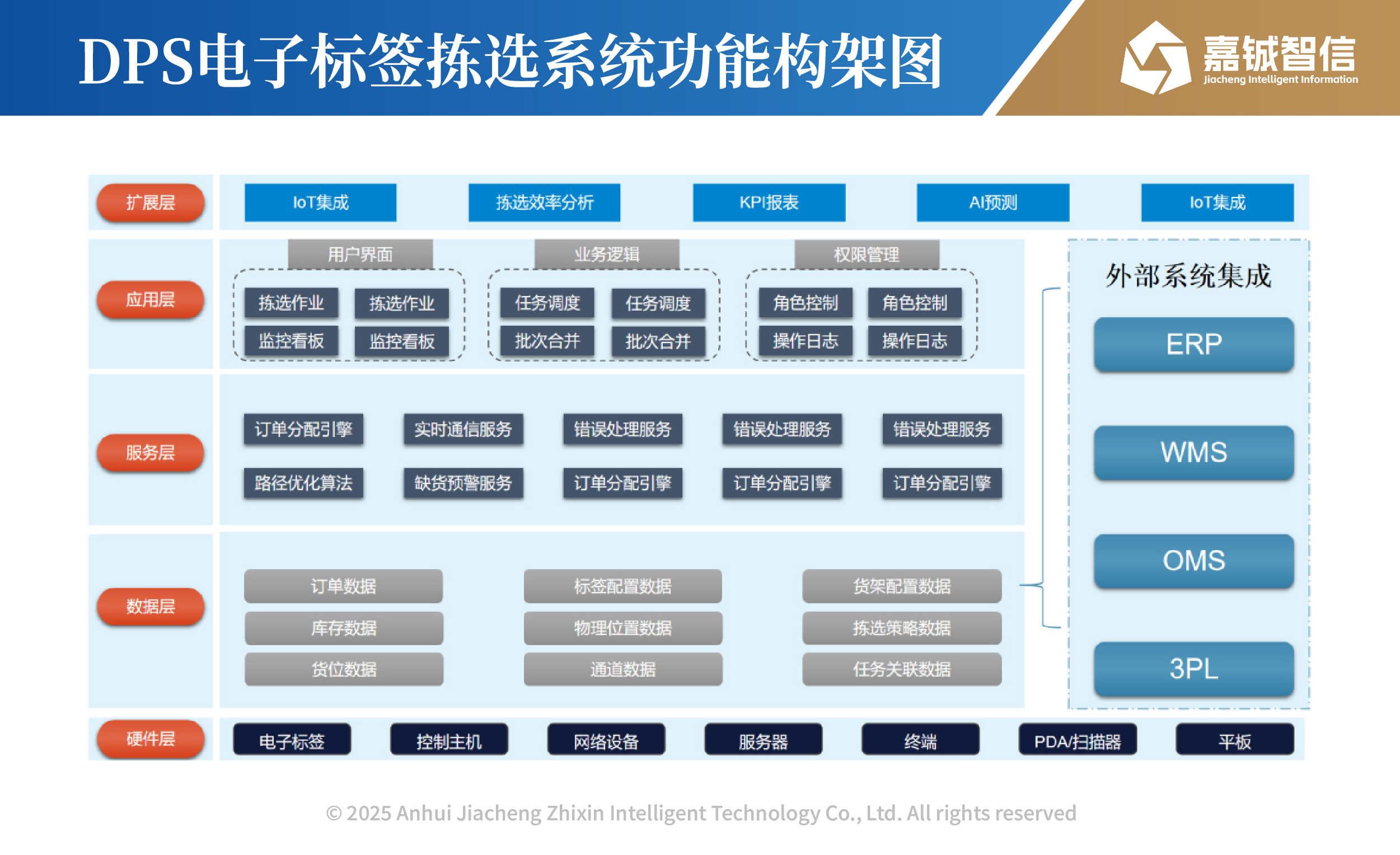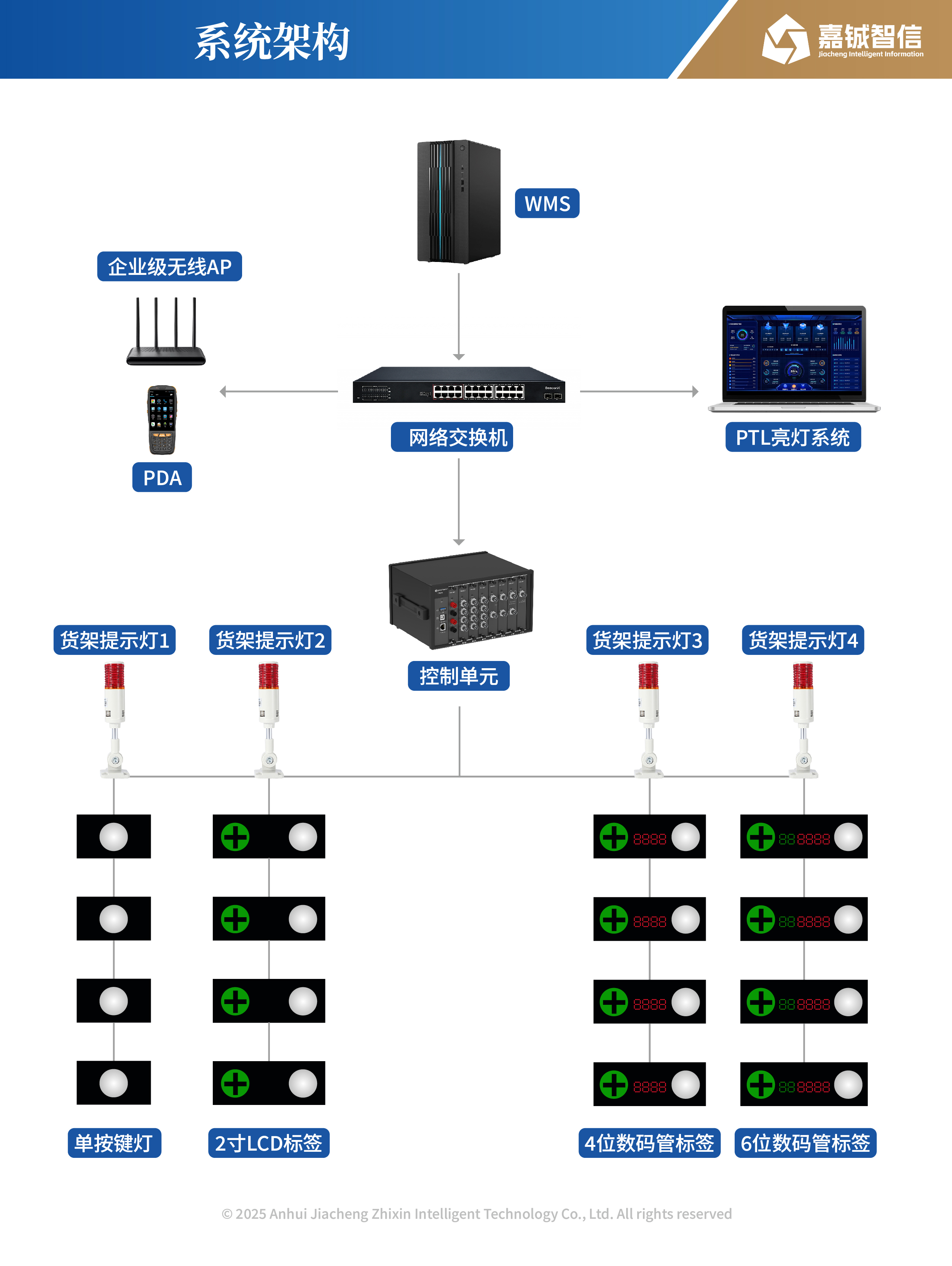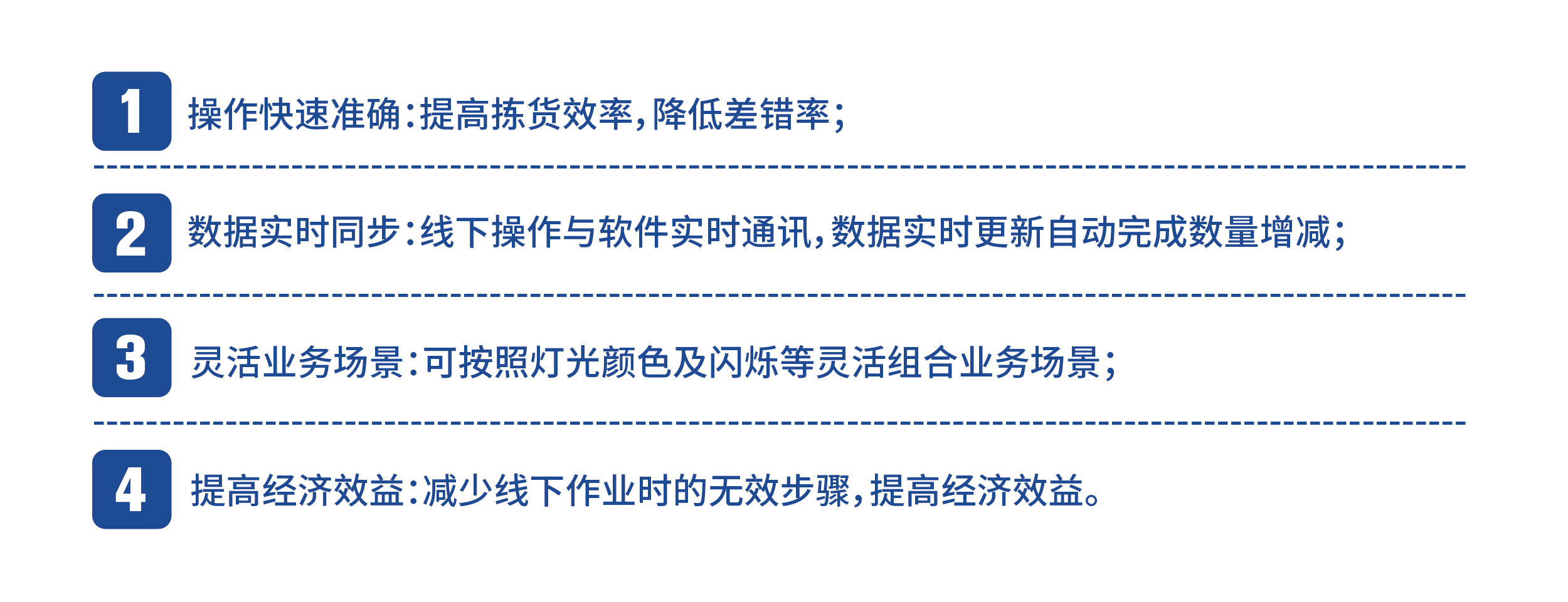 嘉铖电子标签辅助拣货系统(DPS)在基于商品的品种管理拣选方式上,通过在拣货区的货位上安装电子标签、巷道智能信号灯塔等作为该货位的提示单元,并配合条码技术实现订单信息在系统中的交互。在有拣货需求时,系统根据订单清单,发出拣货指令并驱动对应货架的电子标签和信号灯塔的灯光闪亮,操作人员在巷道灯光指引下找到货位,根据电子标签提示拣选所需货品及数量,在拣货完成后拍下确认键,将拣选的数据回传至系统中,完成拣选工作。
