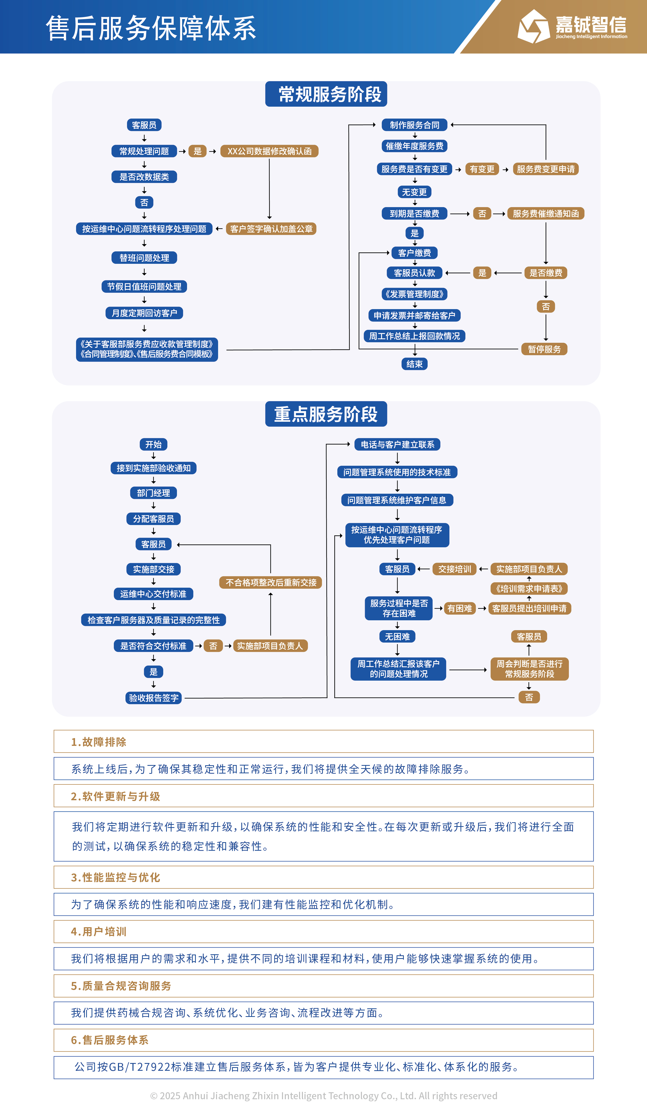 公司按GB/T27922标准建立售后服务体系,售后人员严格按《服务标准》、《问题管理系统技术标准》、《运维中心问题流转制度》、《运维中心问题流转程序》、《运维中心交付标准》、《服务器部署规范》、《值班管理制度》、《客户回访制度》等售后体系对客户进行专业化、标准化、体系化的服务。